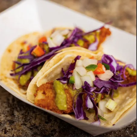Fried Breaded Cod Served With Green Salsa, Shaved Red Cabbage, And Pico.